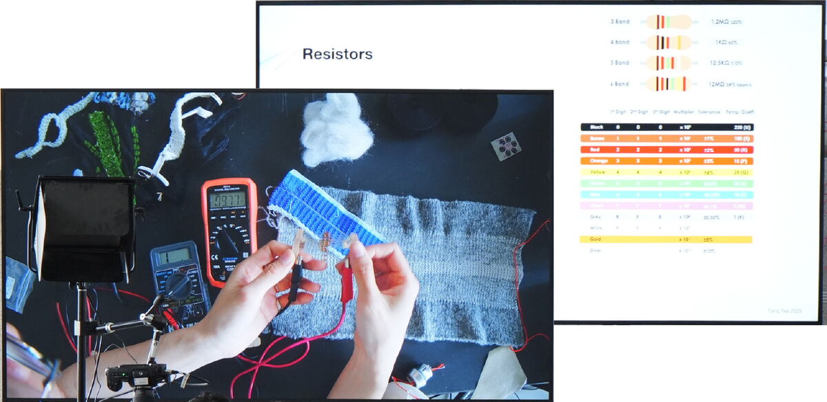 Mit dem zweitägigen Workshop unter der Leitung von Fang Tsai widmete sich InKüLe der Verbindung von Textil, Elektronik und Klang, um mit leitfähigen Materialien und selbstgebauten Soft-Sensoren körperliche Bewegung, Berührung und Dehnung als Eingabesignale für Klang- und Performanceprozesse zu erforschen. Das Format richtete sich an Studierende verschiedener Fachrichtungen – von Visueller Kommunikation über Produktdesign und Sound Studies bis hin zu Bildender Kunst.