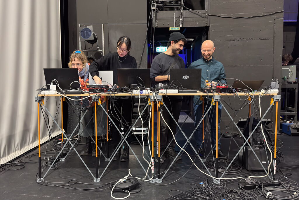 With the performance Hybrid Rituals, InKüLe was part of the event An Experimental Ecology. Art Practice in Dialogue with Disciplines at UNI.T (Theater of UdK Berlin) as part of UdK Berlin's 50th anniversary celebration. The performance invited the audience to experience the interplay of sound, light and movement, controlled through innovative technologies that respond to proximity and touch. This creates a dynamic dialogue between physical and digital spaces, based on artistic methodologies and interfaces developed by InKüLe. Through audiovisual interactions, projection mapping and motion tracking, the stage becomes a hybrid space where materiality, images and sounds merge. The scenario between performance and installation offers an immersive experience that the audience can actively shape.