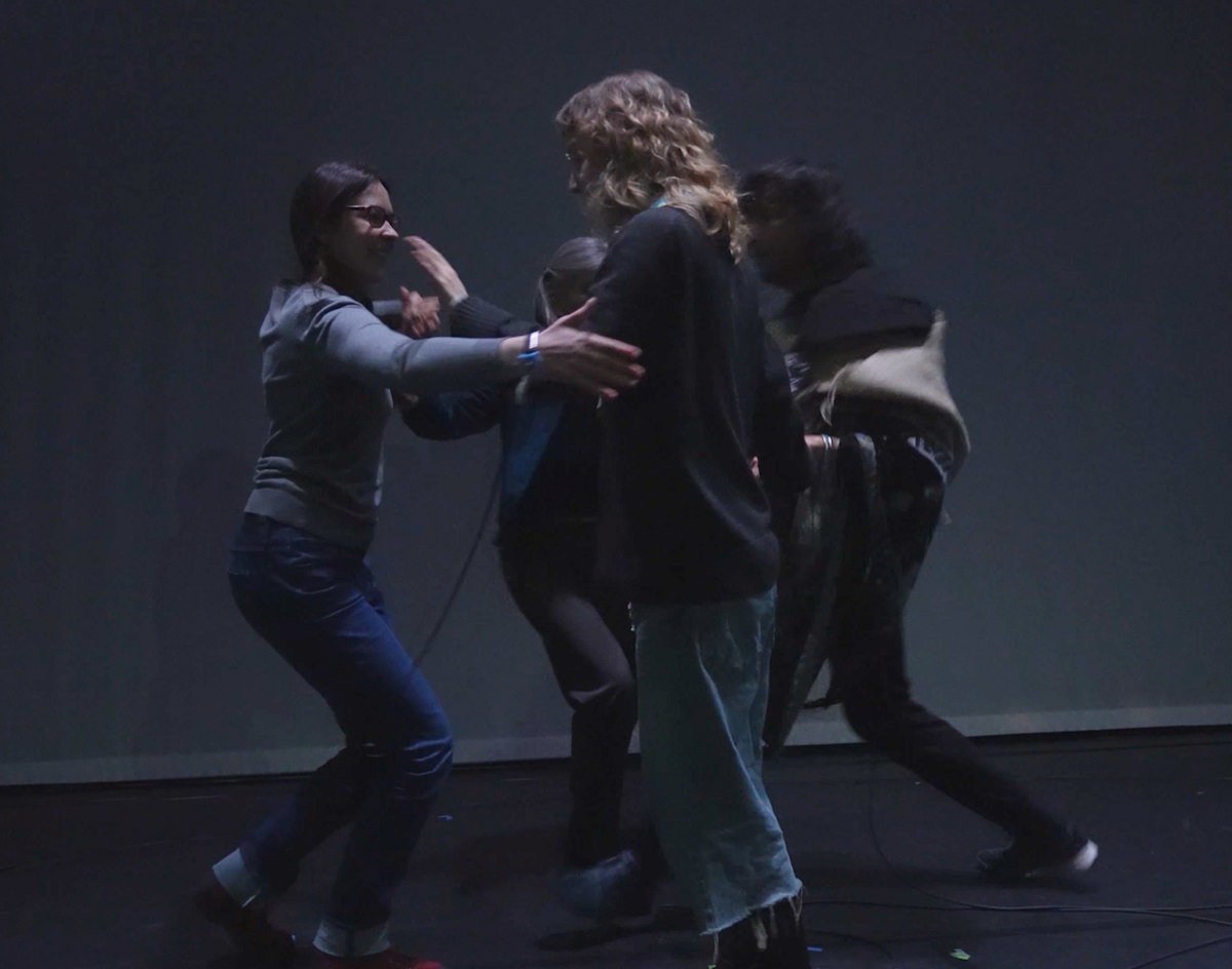 As the interaction continues, the performer extends the experience to the audience by inviting an individual from the seating area onto the stage. The performer hands over a wearable bracelet sensor—connected to the antenna system—to the participant, allowing them to co-create sound through their movements. Over time, three more audience members are invited to join, forming a 2:2 grouping. With two people connected by hand, they become a joined entity which react to the sound together. The space transforms into a collaborative field of embodied interaction, where sound responds dynamically to the evolving choreography of distance, touch and interpersonal presence. This segment foregrounds the emotional and perceptual nuances of closeness, inviting both participants and observers to reflect on the sonic implications of human connection.