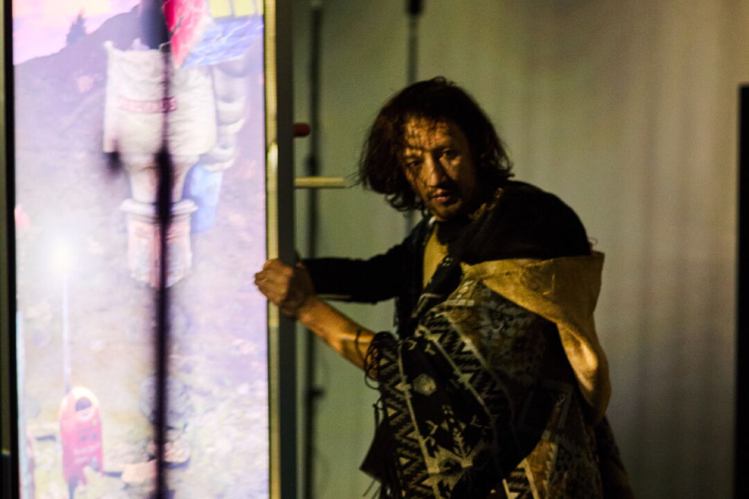 This screen, in its movement, acts as a portal: framing fragmented glimpses of a digital world constructed from 3D scans and imagined landscapes. As it glides across the stage, it reveals not only new visual perspectives but invites a shifting of perception itself. The screen is no longer a passive surface; it becomes a character with agency, a lens through which reality and imagination blur.