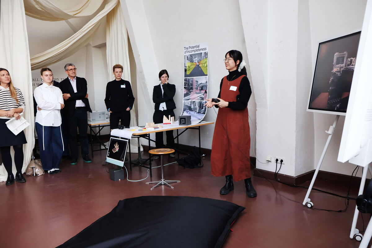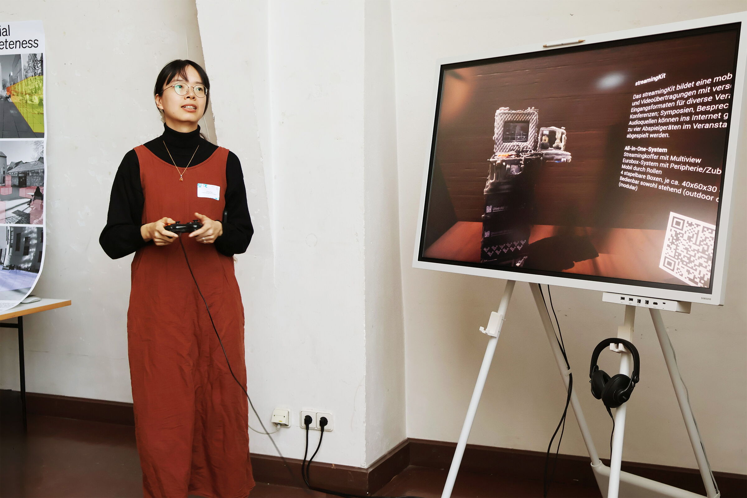 Das Augenmerk unserer Installation LOOPs Virtual Space lag auf der Vermittlung eines hybriden Zusammenspiels von Raumgestaltung, Live-Streaming und gemeinschaftlicher Wissensproduktion. Ein 3D-Scan einer LOOPs-Veranstaltung ermöglichte den Besucher*innen, die räumlichen Dimensionen dieses Formats nachzuvollziehen. Gleichzeitig zeigte das streamingKIT, eine mobile und flexible Einheit zur Audio- und Videoübertragung, wie verschiedene Eingabequellen kombiniert werden können, um immersive Teilhabe sowohl im physischen als auch im digitalen Raum zu ermöglichen. Die in Unreal Engine entwickelte Umgebung visualisierte dabei das erweiterte Konzept des virtuellen Lernraums und bot die Möglichkeit, Ästhetik und Atmosphäre beim hybriden Lehren nachzuvollziehen.
