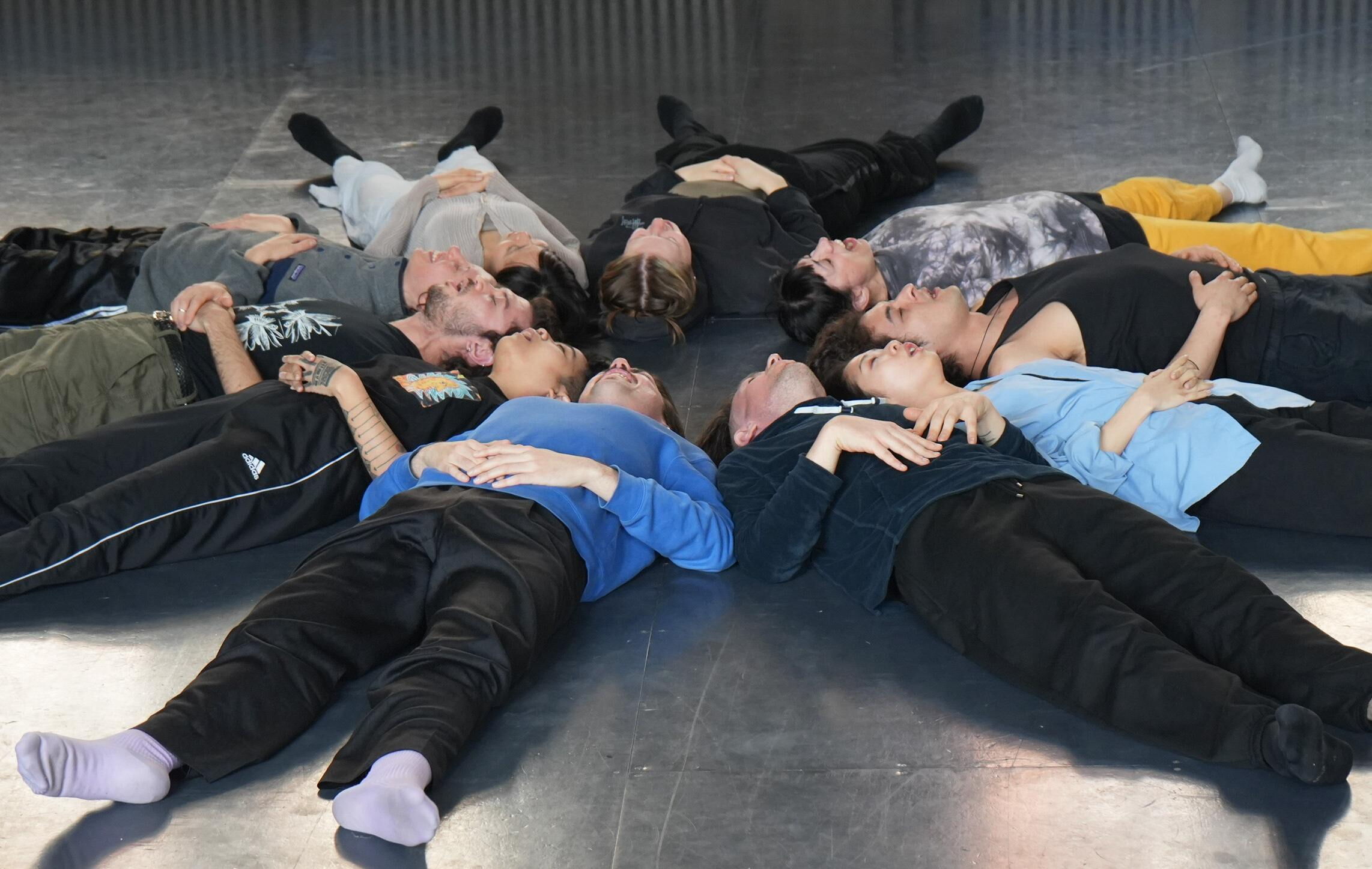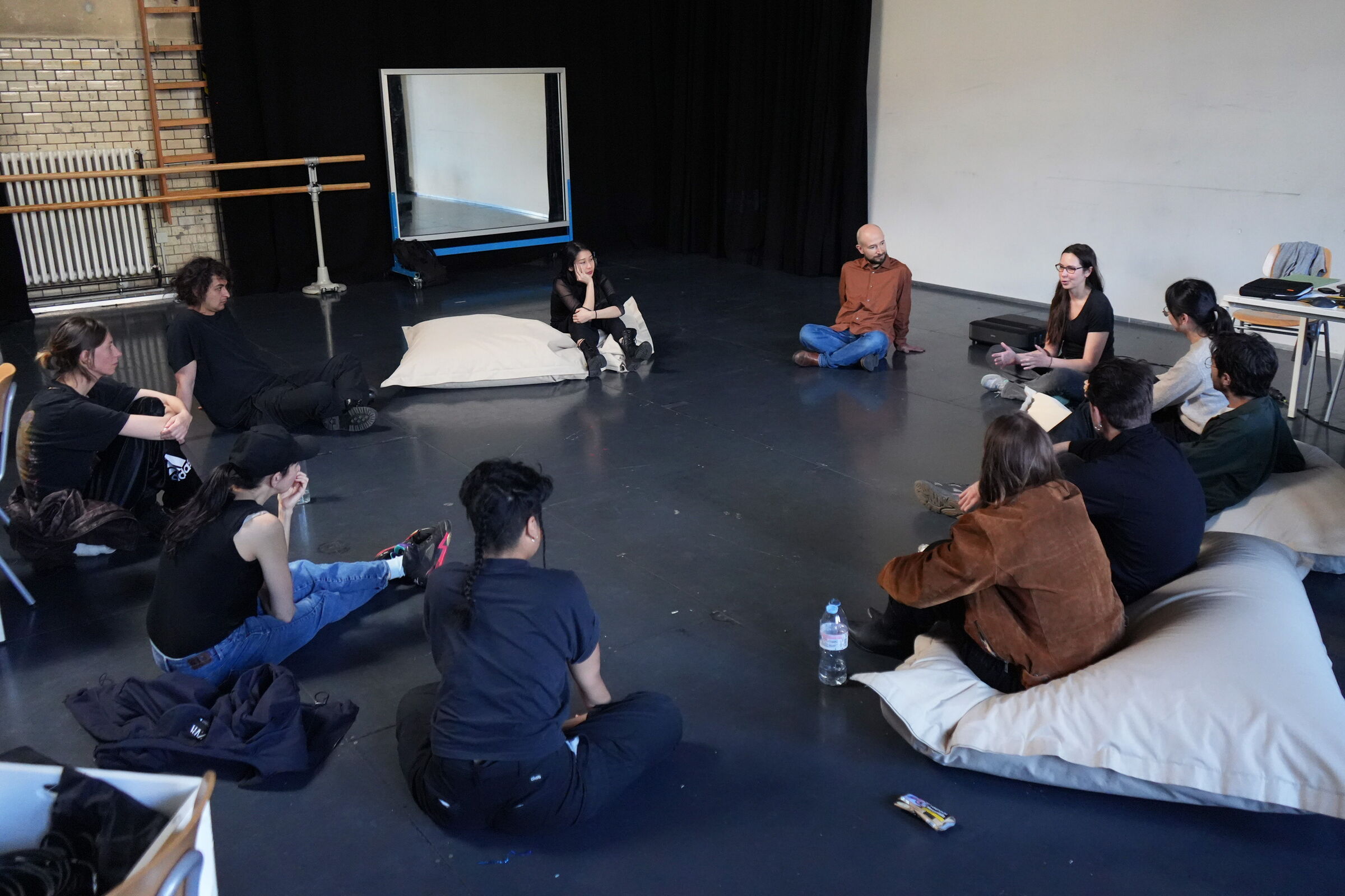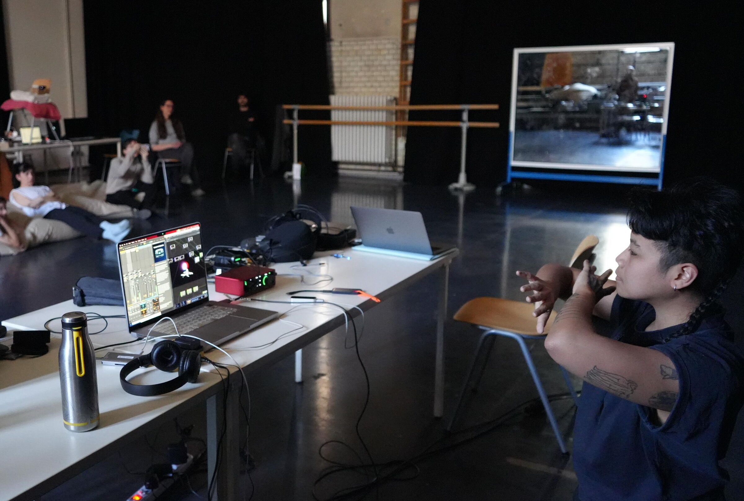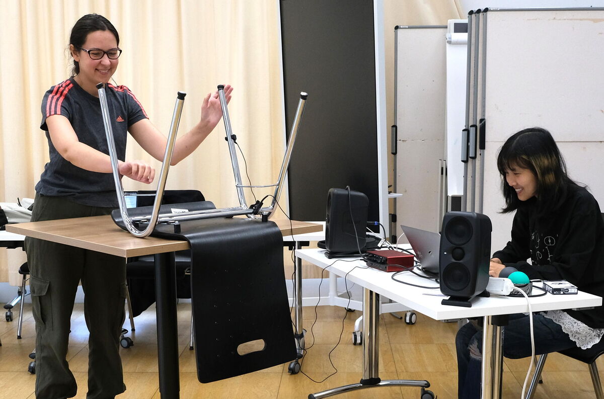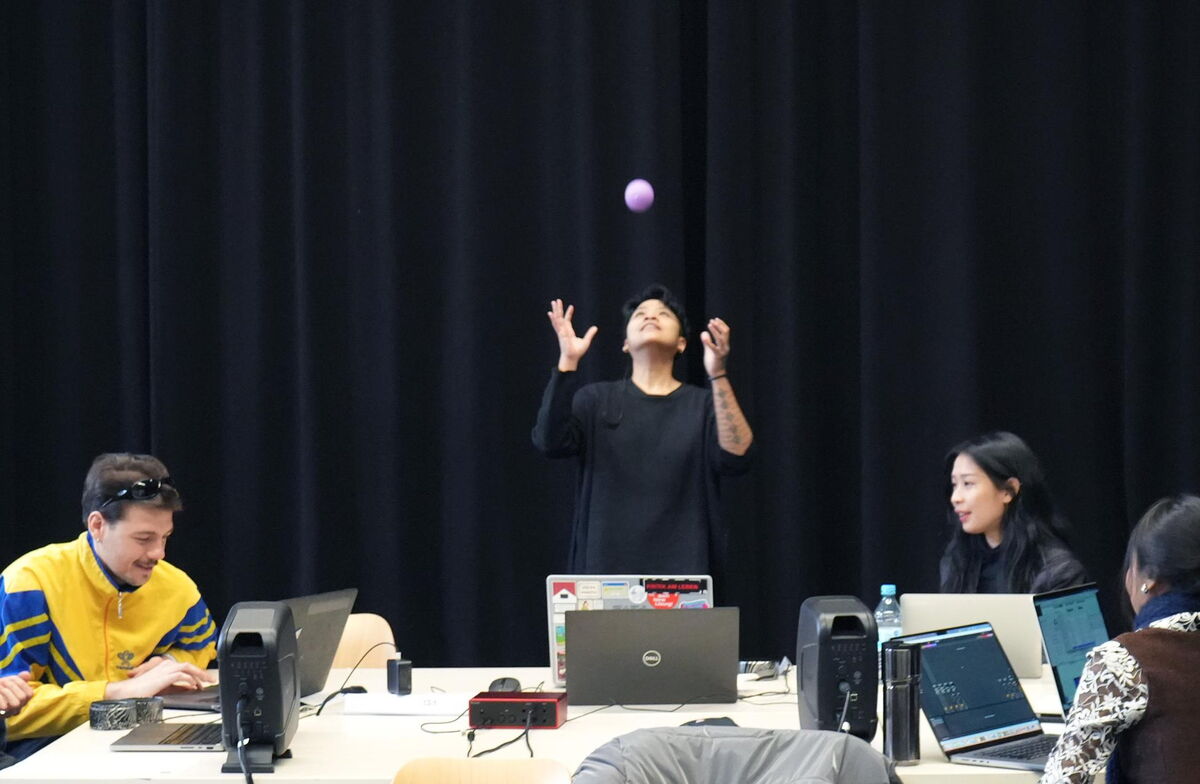 Anschließend vertieften die Teilnehmenden die Erprobung der Setups mit Kamera-Tracking und Kontaktmikrofon, ergänzt durch eine künstlerische Einführung von Christine Bonansea mit Fokus auf die körperlich-sensorische Dimension der Klanginteraktion. In Übungen zu räumlichem Bewusstsein, rollenbasierter Improvisation und instant composition erforschten die Teilnehmenden Performance als dynamische Interaktion zwischen Körper, Klang und Umgebung, wobei das Studio selbst zu einem aktiven Kollaborateur wurde.