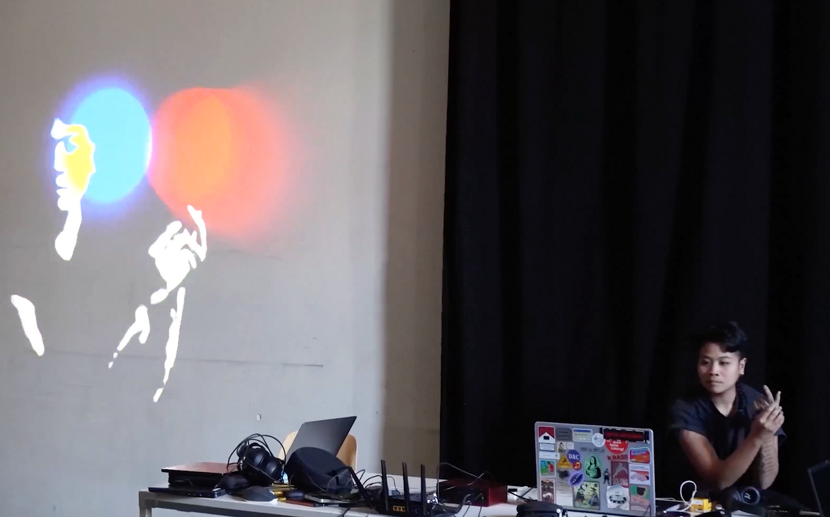 Ein weiteres Projekt widmete sich der audiovisuellen Choreografie mit TouchDesigner, um körperliche Gesten visuell zu erweitern. Eine Studierende steuerte mit der Bewegung ihrer Arme sowohl die Klangparameter als auch einige visuelle Elemente, die auf die Wand projiziert wurden.