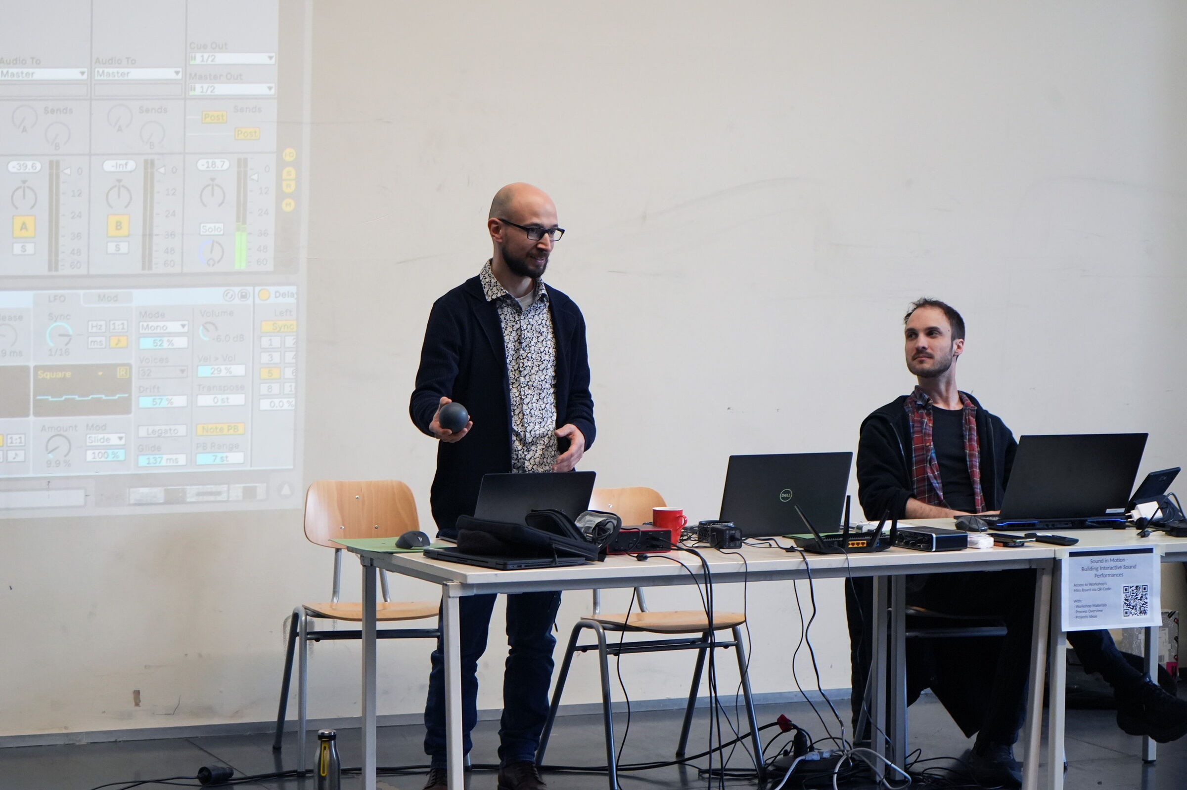 Der Tag der ersten Workshopphase begann mit einer Einführung in zentrale Technologien und künstlerische Positionen zu Klang und Bewegung, begleitet von einem Überblick über mögliche Sensorik- und Softwarekombinationen. Marcello Lussana hielt einen Vortrag über interaktive Musiksysteme, in dem er einen Überblick über deren historische Entwicklung, die technologischen Grundlagen und die künstlerischen Anwendungsbereiche gab. Es wurden Setups und Beispiele des Oddballs und des Smartphones vermittelt. Ein gemeinsames Miro-Board diente als Materialsammlung.