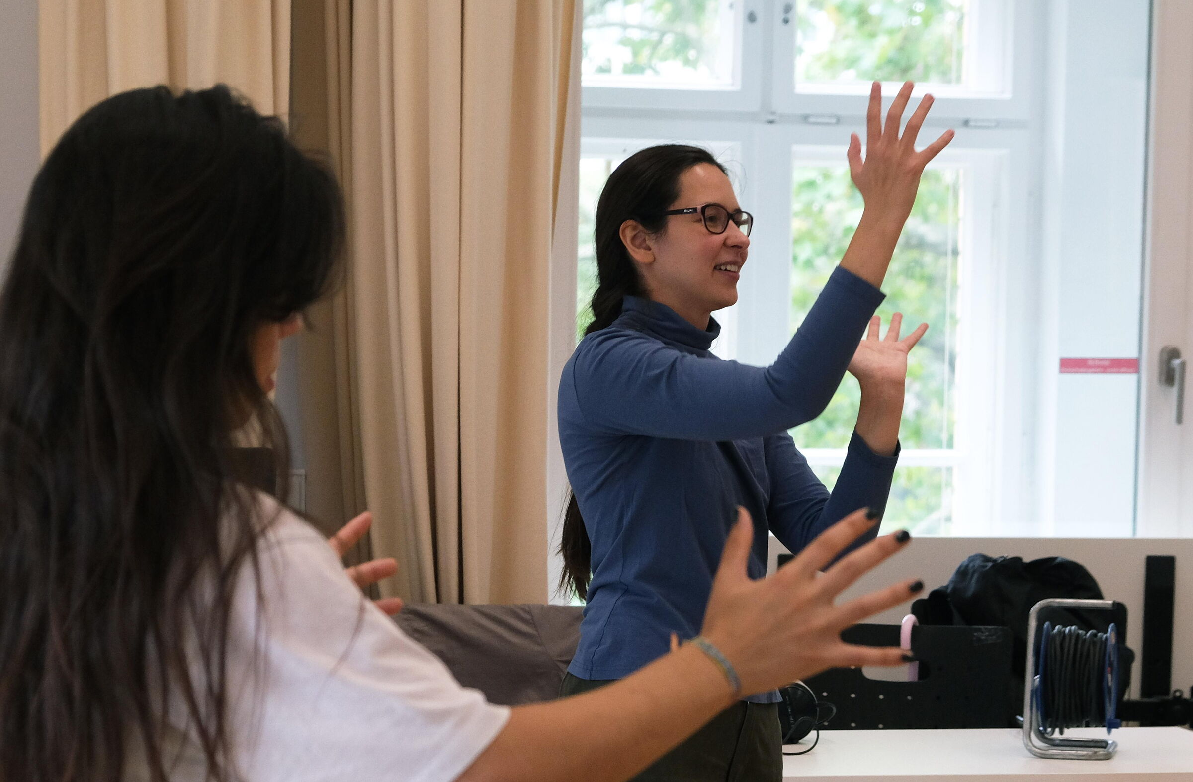 Um den Übergang von den technischen Übungen hin zu eigenen künstlerischen Ansätzen zu unterstützen, führte Anastasia Putsykina das Reflexionsformat „Research Topics“ ein. Über gezielte Leitfragen wie „Wie reagiert der Körper auf verschiedene Klanggeräte?“, „Wie lässt sich Bewegung als Kommunikationsform verstehen?“ oder „Können Klanggeräte als Erweiterung des Körpers fungieren, etwa wie eine Antenne?“ strukturierten die Teilnehmenden ihre bisherigen Erfahrungen und hielten ihre Beobachtungen in Texten oder Skizzen fest. Diese methodische Rahmung förderte eine bewusste Auseinandersetzung mit der eigenen Körperwahrnehmung, den genutzten Klangsystemen und den sich daraus ergebenden Ausdrucksformen.