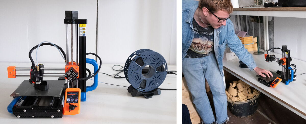 Der Prusa Mini+ ist ein kompakter FDM-Drucker, der thermoplastisches Filament Schicht für Schicht zu physischen Objekten aufbaut. Er eignet sich ideal für schnelle Prototypen, funktionale Bauteile oder experimentelle Oberflächen. Dank seinem Einbau in eine Transportbox und einfacher Bedienung ist der Drucker mobil und flexibel einsetzbar.