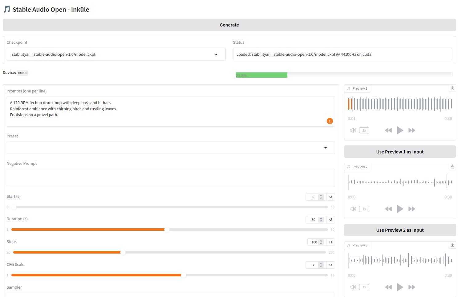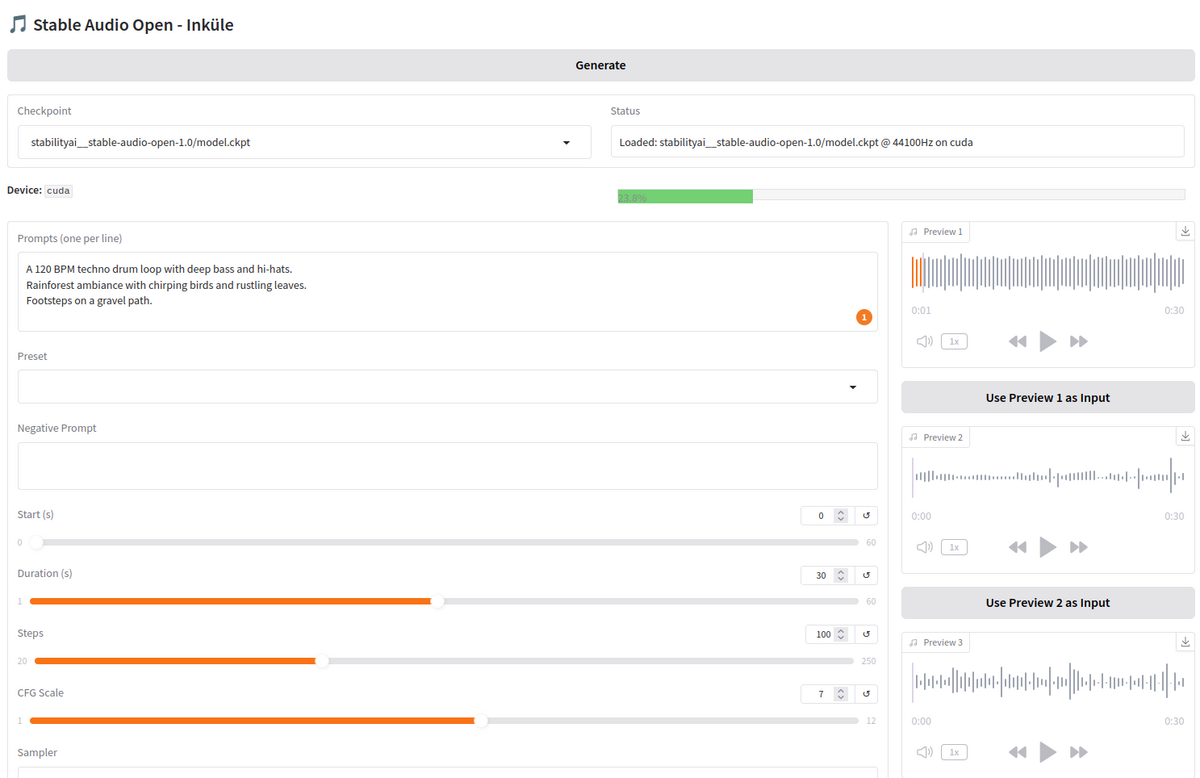 Das Stable Audio Open-Modell von Stability AI erweitert den interaktiven Ansatz durch KI-basierte Klanggenerierung und kann auf Basis von Text- oder Audio-Prompts realistische Audiobeispiele erzeugen. Die erarbeitete InKüLe-Version Stableaudio GUI läuft lokal auf einem vorinstallierten, leistungsstarken Laptop und erlaubt eine intuitive Nutzung ohne Programmierkenntnisse.